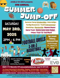 Join us for a day filled with fun, activities, 3-on-3 basketball, football drills, PRIZES, food, youth entrepreneur workshop, summer camp scholarships, summer safety, and summer resources!