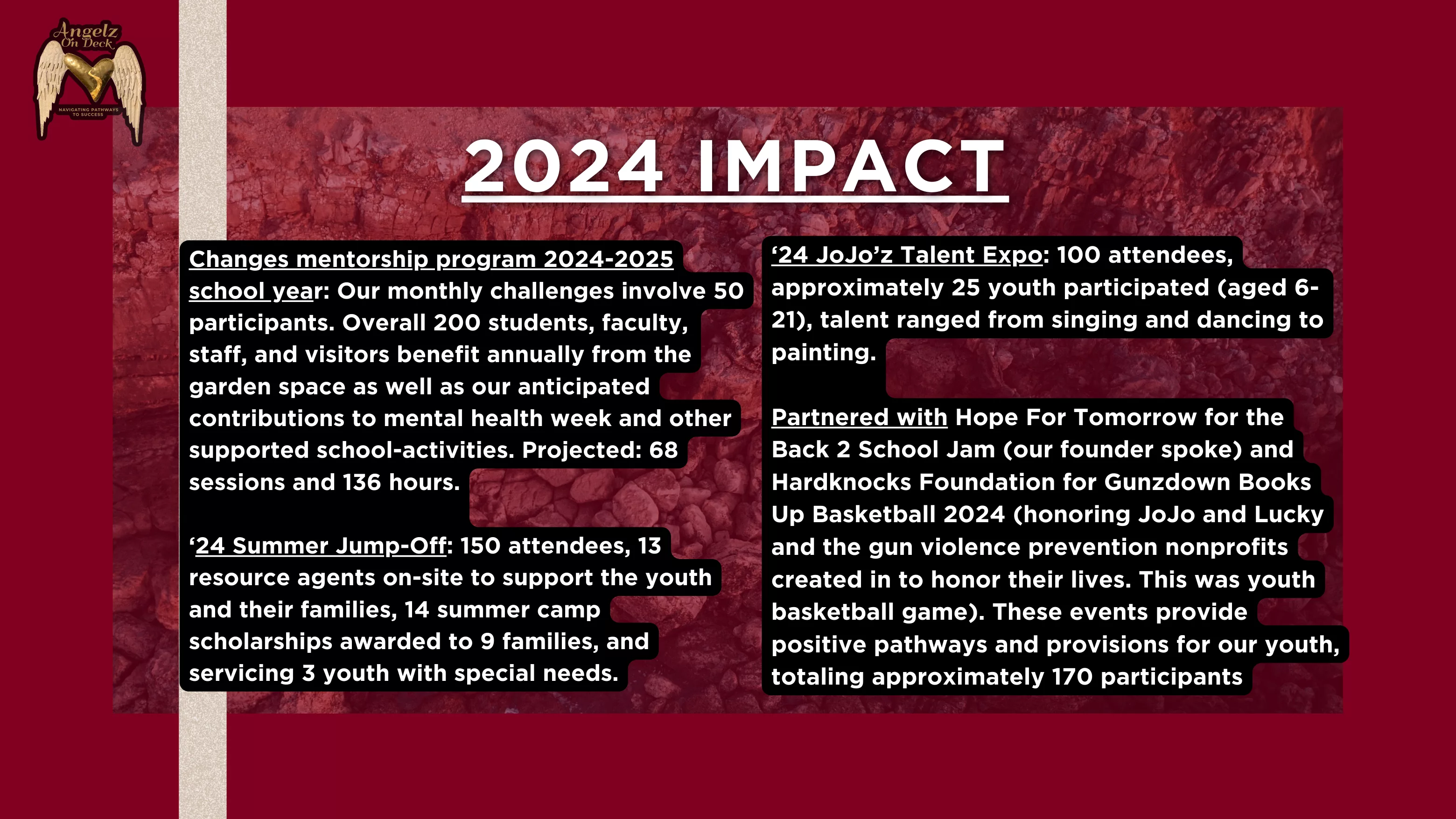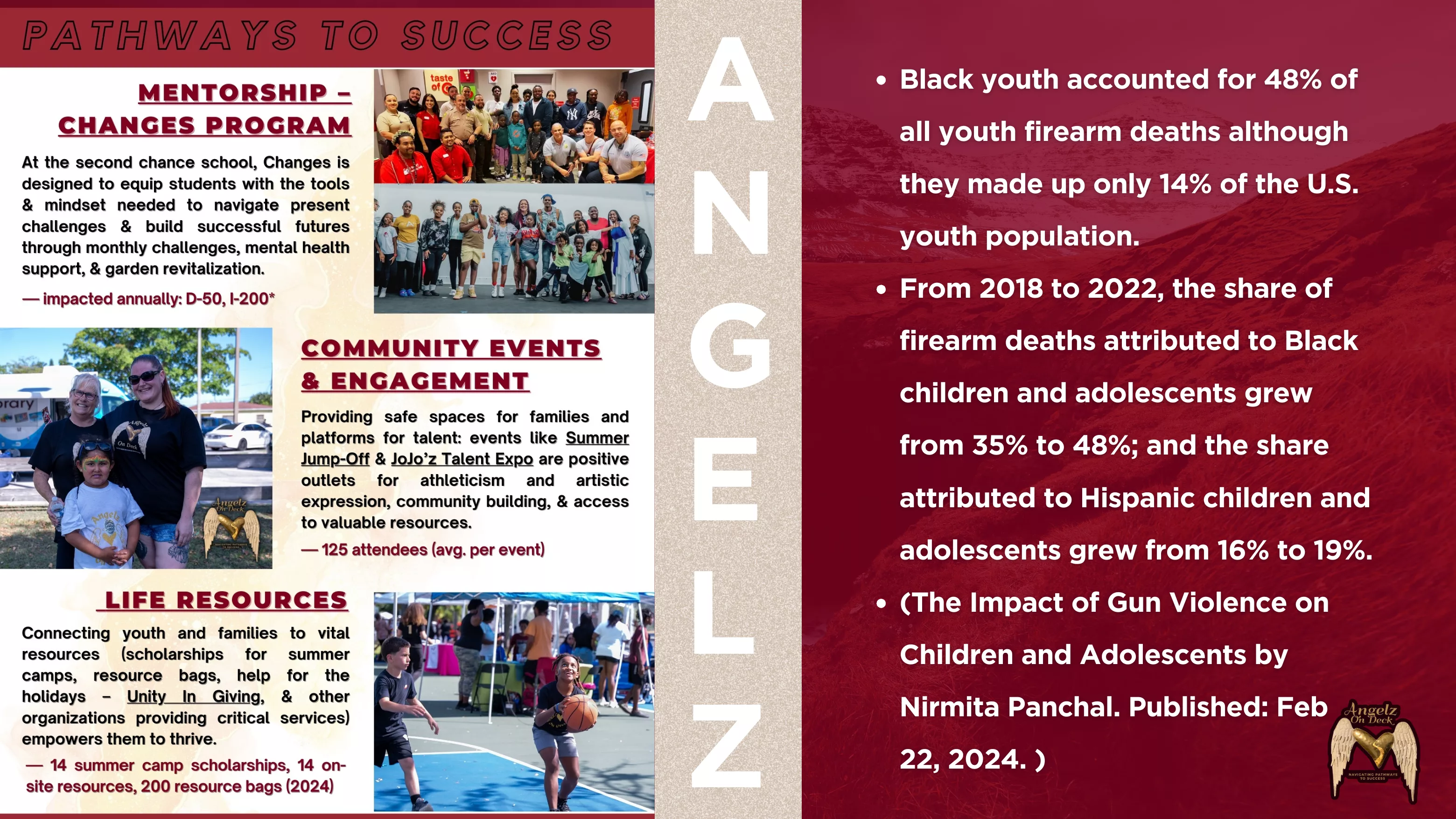 Children benefit immensely from traveling outside their impoverished, violence-filled neighborhoods. Experiencing life beyond the chaos and killings opens their eyes to the limitless possibilities of success and prosperity for minorities. With your support, we hope to add this layer to the Angelz On Deck experience for our youth.